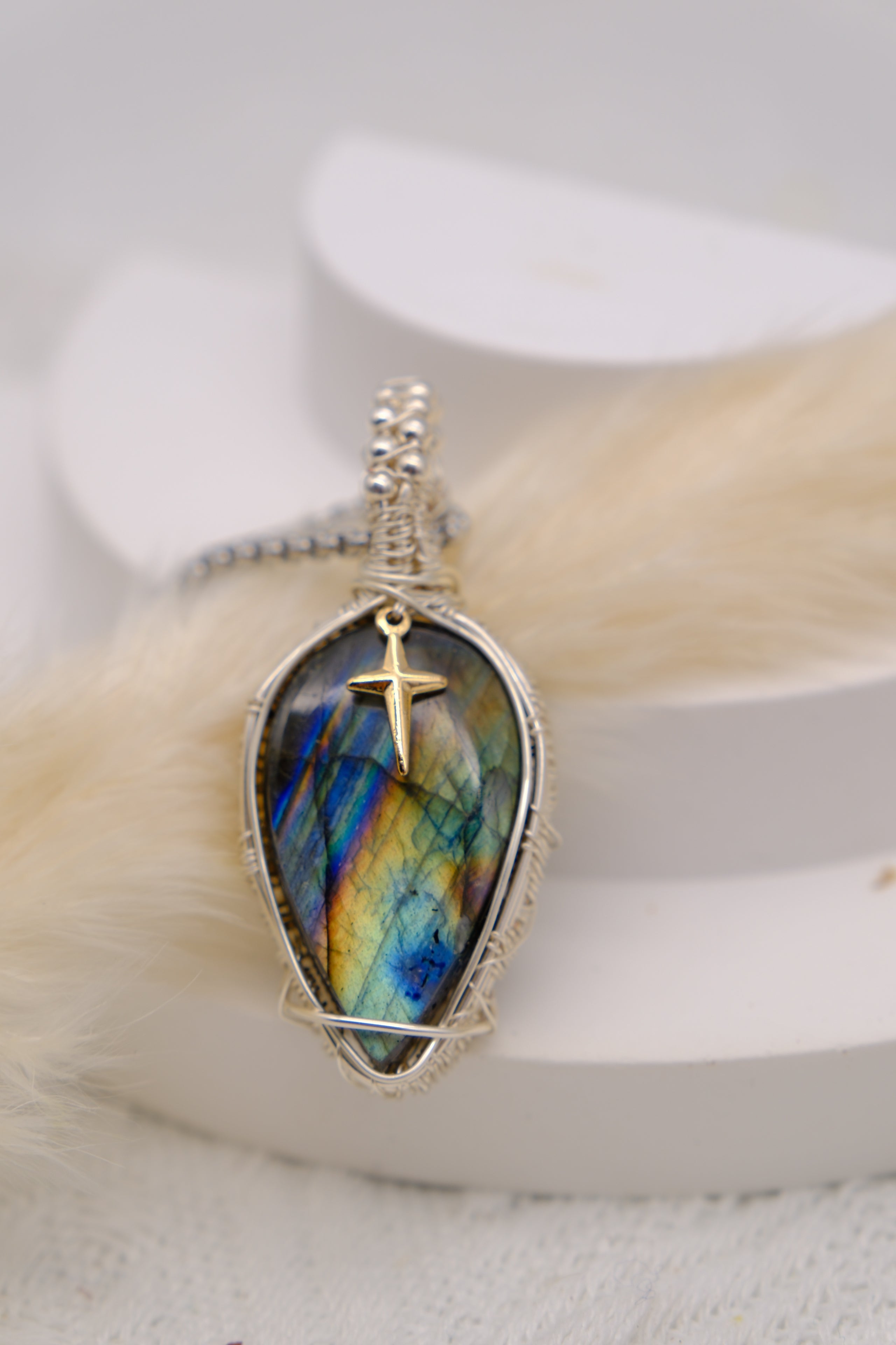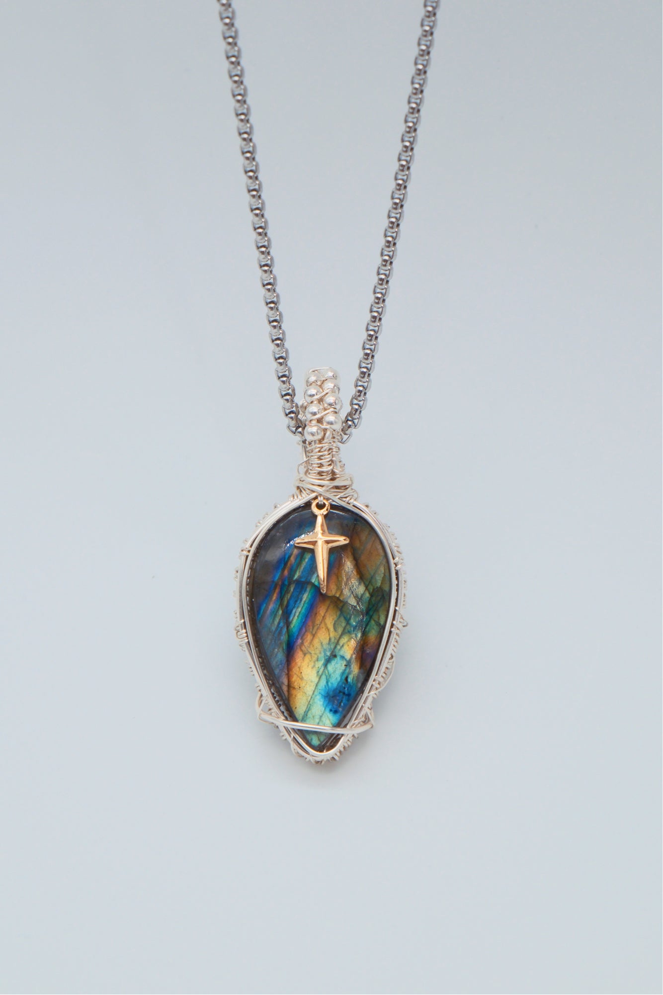 Golden Cross Handcrafted Pendant Necklace with Labradorite