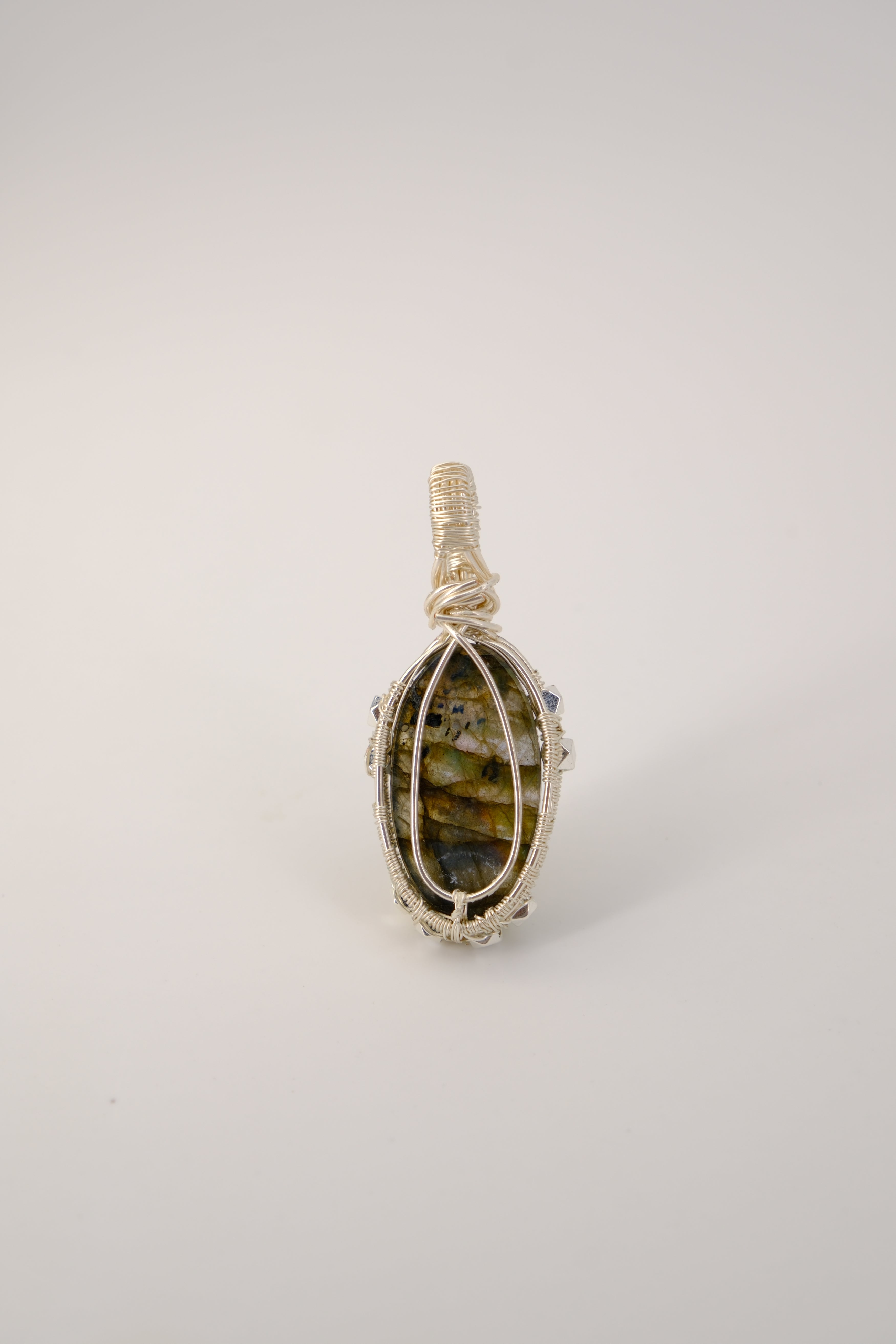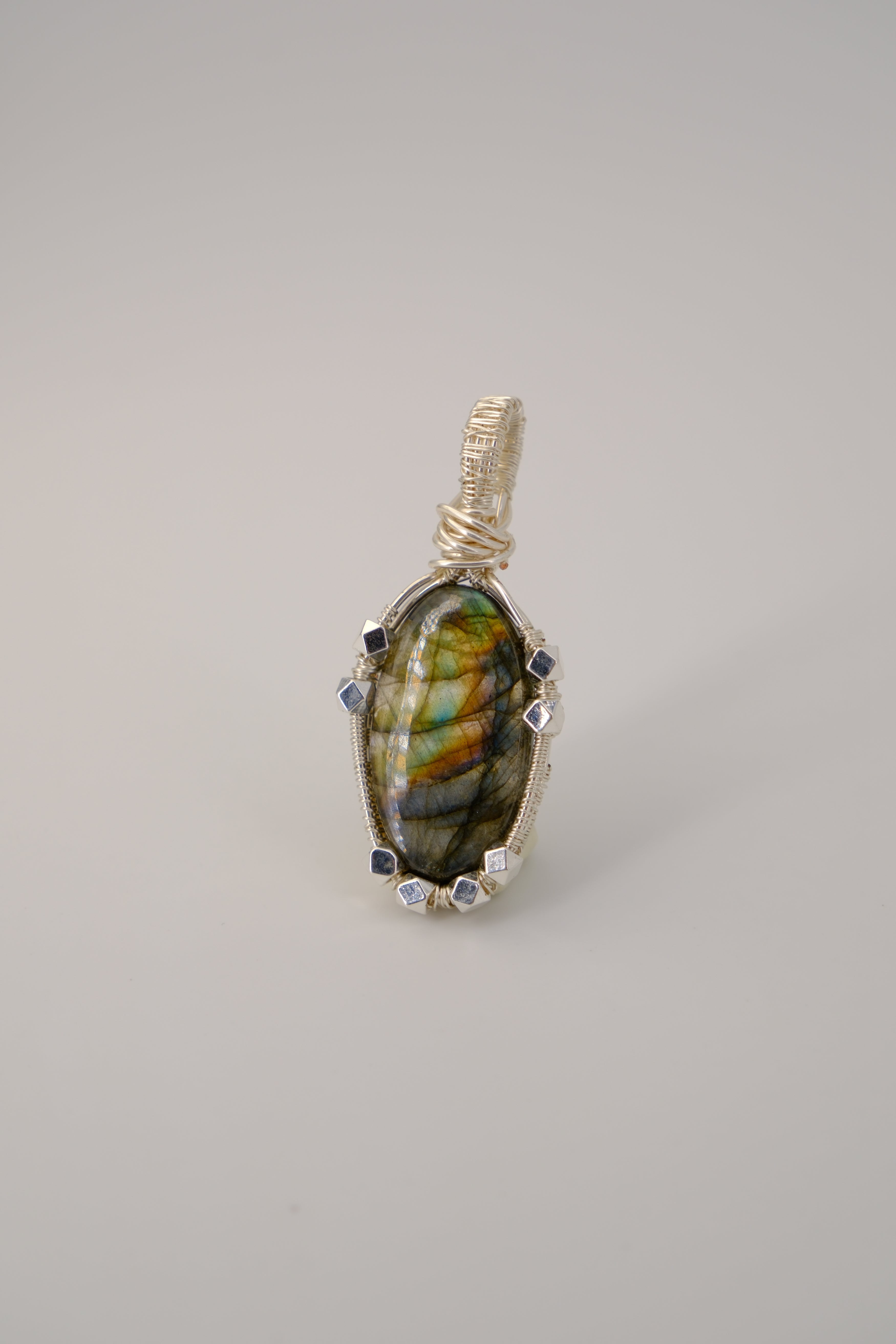 Faceted Labradorite Pendant with Silver Wrap and Hex Accents